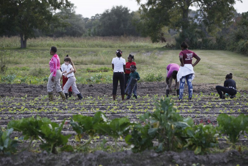 Previous Image Next Image Marshview Community Organic Farm Sarà Reynolds Green, in pink, leads students as they transplant greens. From left are Green, Carolyn Durrance, Taylor Linyard, Jameah Moore, Zariah Green, Jameka Young, Janice Baker and Kalila Saunders. Photos © 2011 Denise McGill Like Loading...